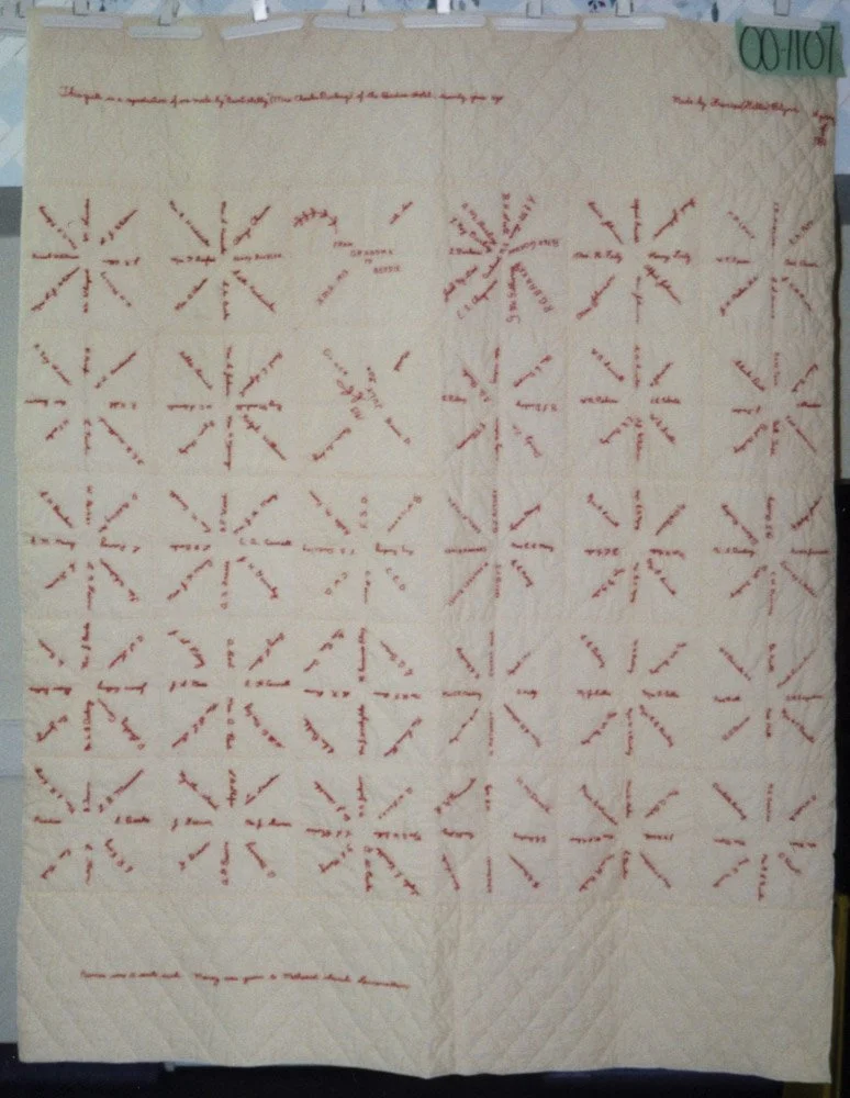 #00-1107 Unknown DateReproduction QuiltSynthetic FabricsPolyesterCottonFlour BagsSugar BagsPieceworkEmbroideredStraight SetBack Turned FrontMachine and hand sewn Jun 22 Written By Christel LeBlanc Quilt made by Francis Blynn Christel LeBlanc http://forestfriend.ca/