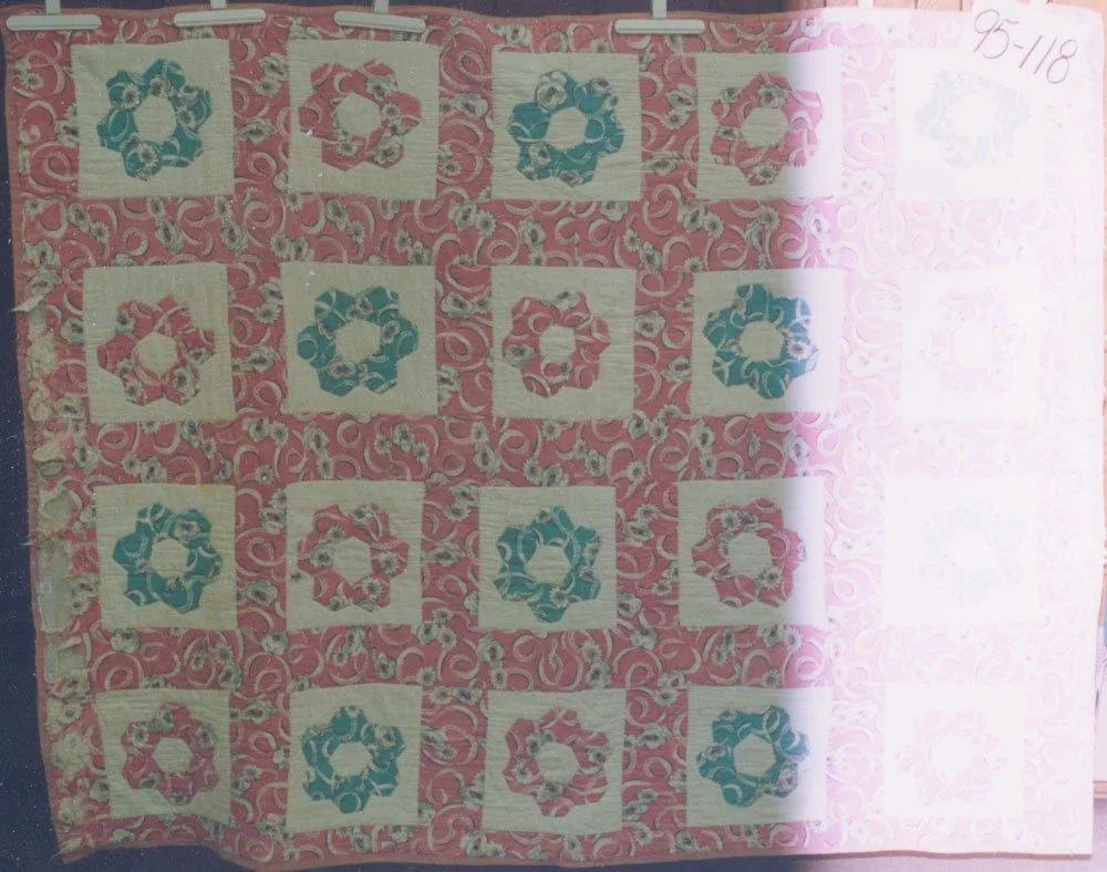 #95-118 1940sGuysboroughGrandmother's flower gardenHexagonCottonStraight SetHome-cut Straight BindingFront Turned BackMachine and hand sewn Aug 11 Written By Christel LeBlanc Quilt Top made in Ecum Secum, Nova Scotia Christel LeBlanc http://forestfriend.ca/