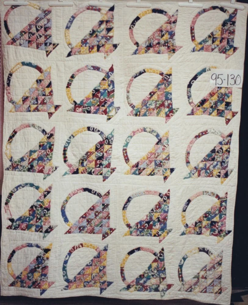#95-130 1930sLunenburgUtilityHope ChestBasketCottonStraight SetHome-cut Straight BindingFront Turned BackHand sewn Aug 11 Written By Christel LeBlanc Quilt made by Ruth Whynot in Mahone Bay, Nova Scotia Christel LeBlanc http://forestfriend.ca/