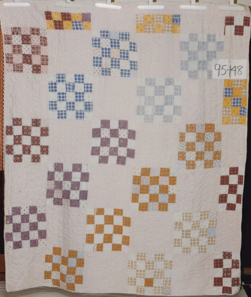 #95-148 1920sNew BrunswickUtility9-patchCottonHome-cut Straight BindingFront Turned BackMachine and hand sewnInheritance Aug 11 Written By Christel LeBlanc Quilt made by Florence Bannister Lodge in Saint John, New Brunswick Christel LeBlanc http://forestfriend.ca/