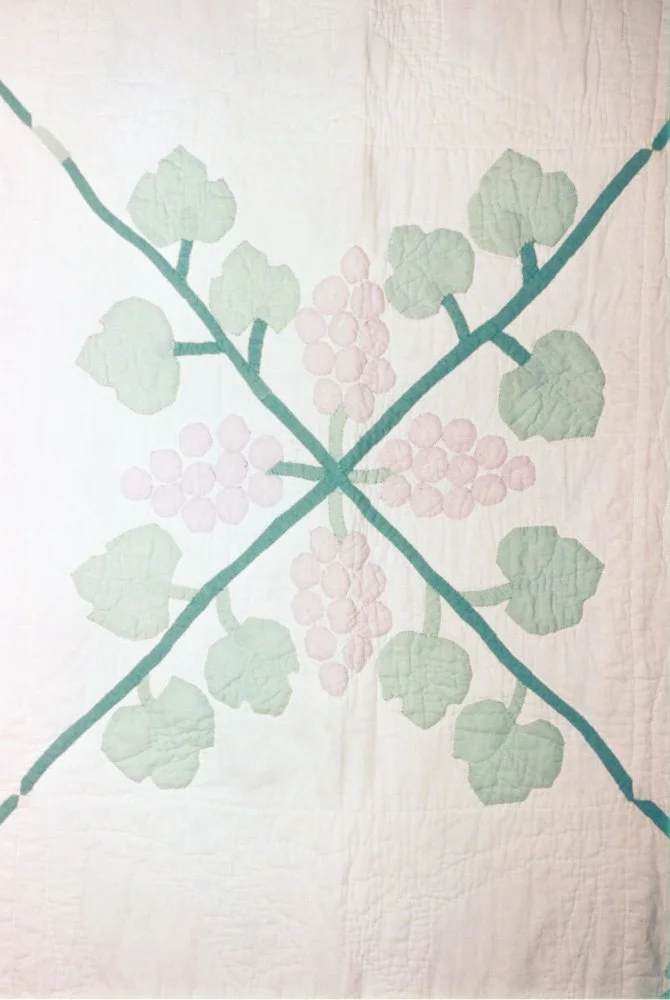 #95-226 1930sDigbyUtilityGrapevineCottonStraight SetAlternating SetWithout SashHome-cut Straight BindingMachine and hand sewnGift Aug 11 Written By Christel LeBlanc Quilt made by Lucy Jane Pyne in Freeport, Nova Scotia Christel LeBlanc http://forestfriend.ca/
