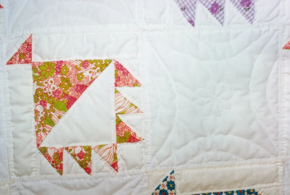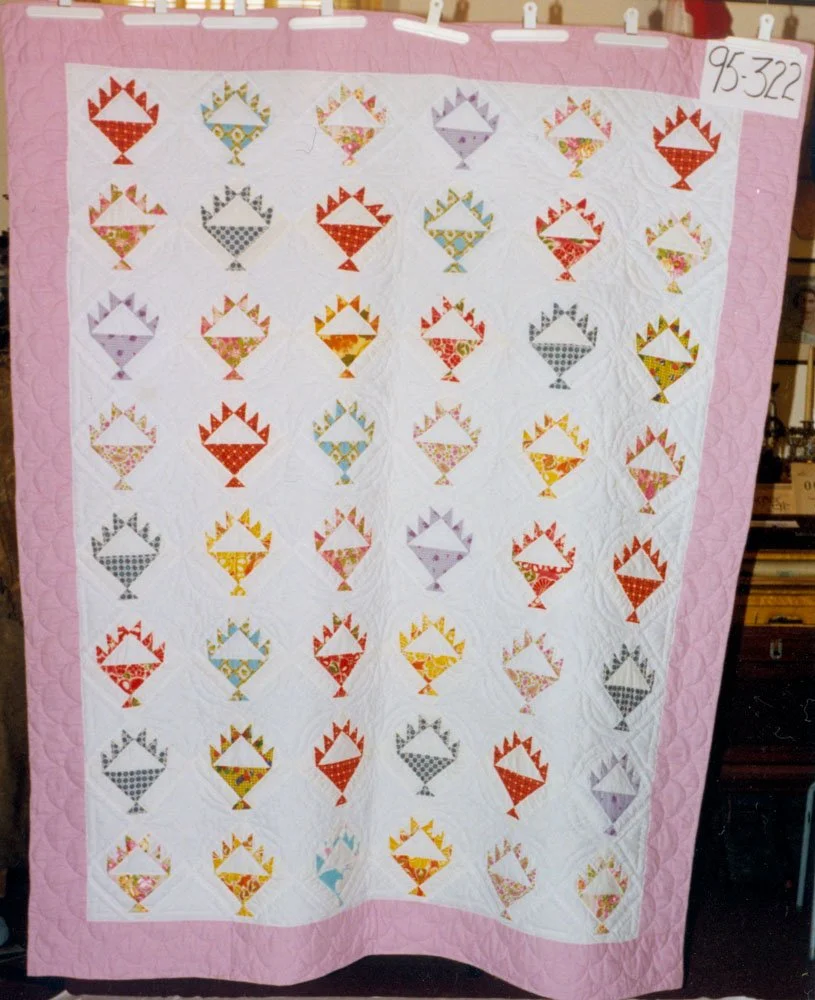 #95-322 1960sYarmouthUtilityBasketCottonDiagonal SetHung SetFront Turned BackMachine and hand sewn Aug 11 Written By Christel LeBlanc Quilt made by Glenna King in Brooklyn, Nova Scotia Christel LeBlanc http://forestfriend.ca/