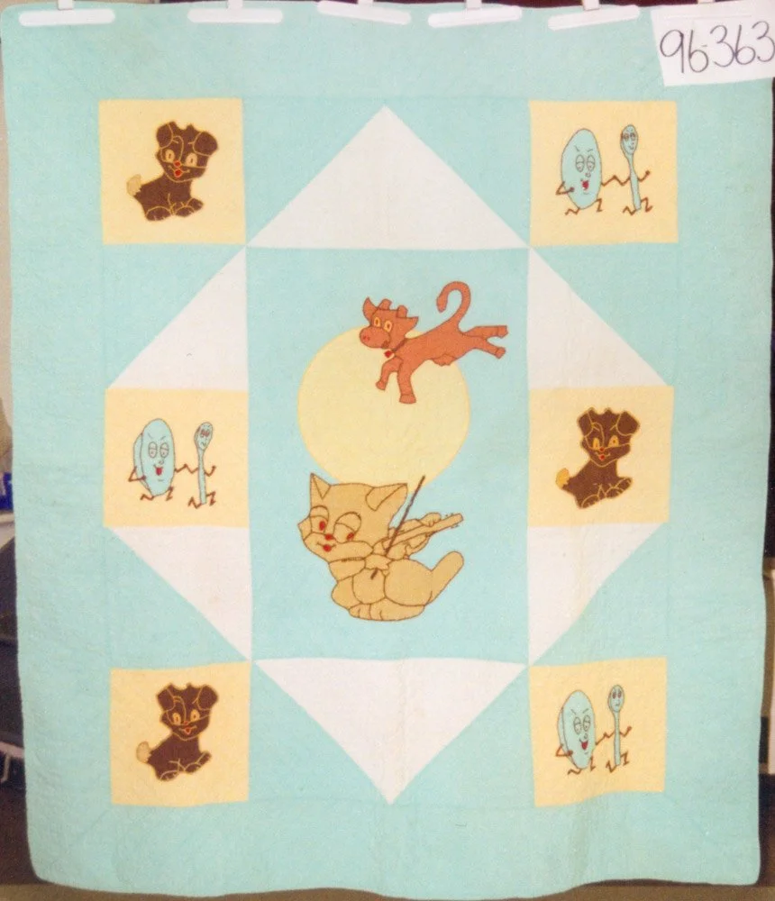 #96-363 1960sHantsUtilityGiftNursery RhymeCottonStraight SetHome-cut Straight BindingMachine and hand sewn Aug 10 Written By Christel LeBlanc Quilt made by Mabel Scott in Noel, Nova Scotia Christel LeBlanc http://forestfriend.ca/