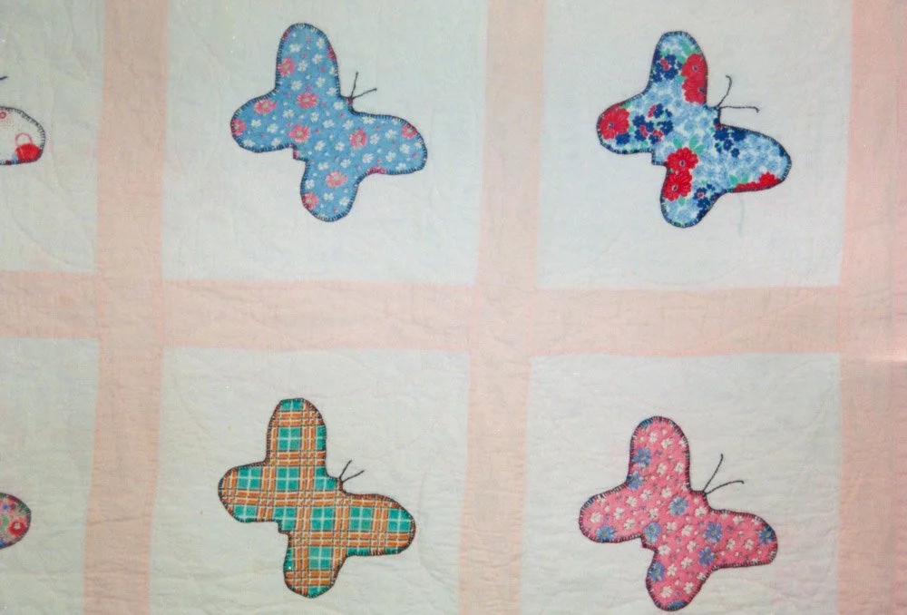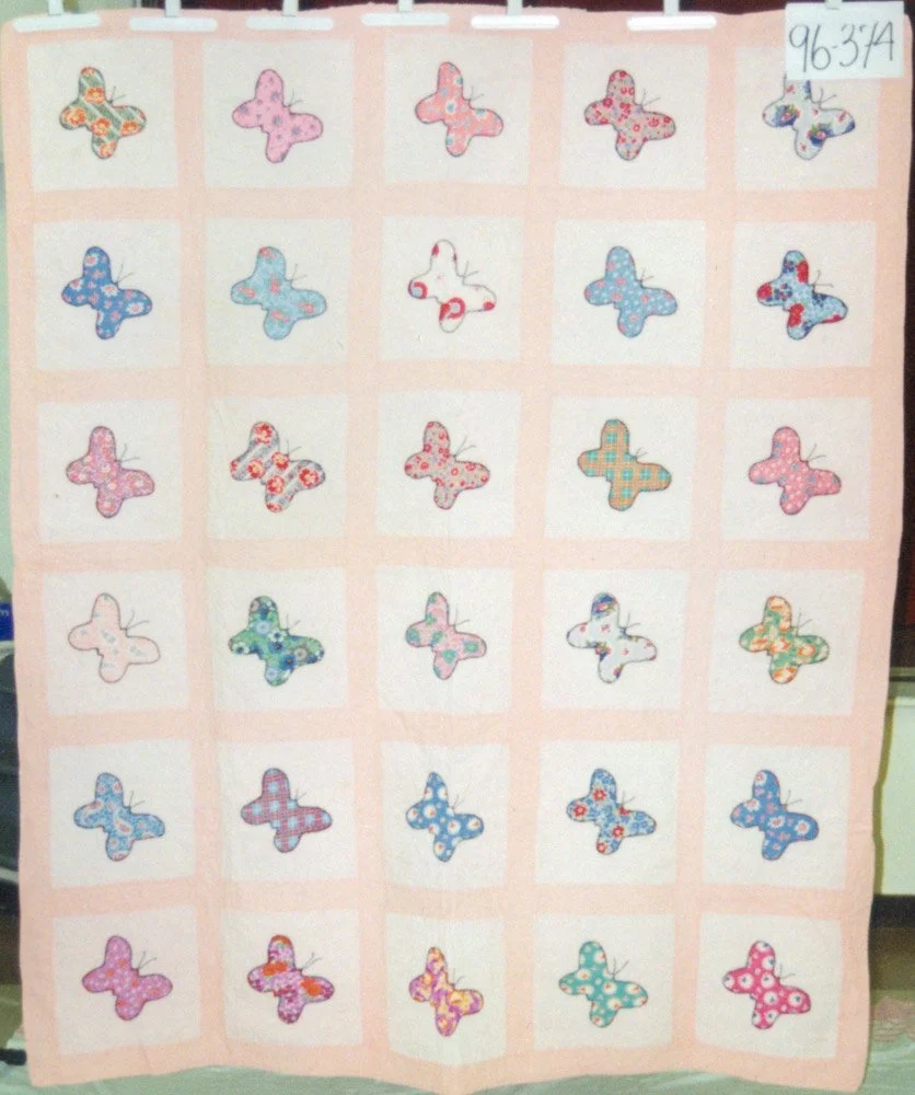 #96-374 1940sHalifaxWeddingGiftButterfliesAppliqueCottonStraight SetWith SashHome-cut Straight BindingFront Turned BackMachine and hand sewn Aug 10 Written By Christel LeBlanc Quilt made by Levina Ward in Lower Sackville, Nova Scotia Christel LeBlanc http://forestfriend.ca/