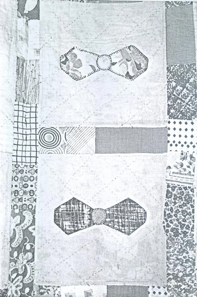 #96-415 1950sUtilityGiftBow TieAppliqueCottonStraight SetWith SashHome-cut Straight BindingFront Turned BackHand sewn Aug 9 Written By Christel LeBlanc Quilt made by Helen Kenney Christel LeBlanc http://forestfriend.ca/