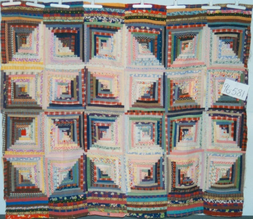 #96-581 Unknown DateCumberlandUtilityYard SaleLog cabinCottonWoolStrip piecingStraight SetHand sewn Aug 4 Written By Christel LeBlanc Quilt made by Barbara Barkhouse in Westchester, Nova Scotia Christel LeBlanc http://forestfriend.ca/
