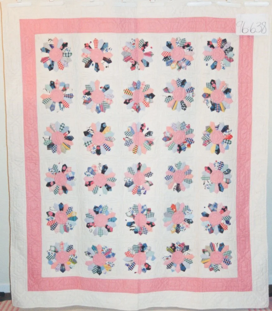 #96-638 1940sCape BretonUtilityDresden plateCottonStraight SetHome-cut Straight BindingFront Turned BackMachine and hand sewnInheritance Aug 2 Written By Christel LeBlanc Quilt made by Marjorie Jean Boston in Ross Ferry, Nova Scotia Christel LeBlanc http://forestfriend.ca/