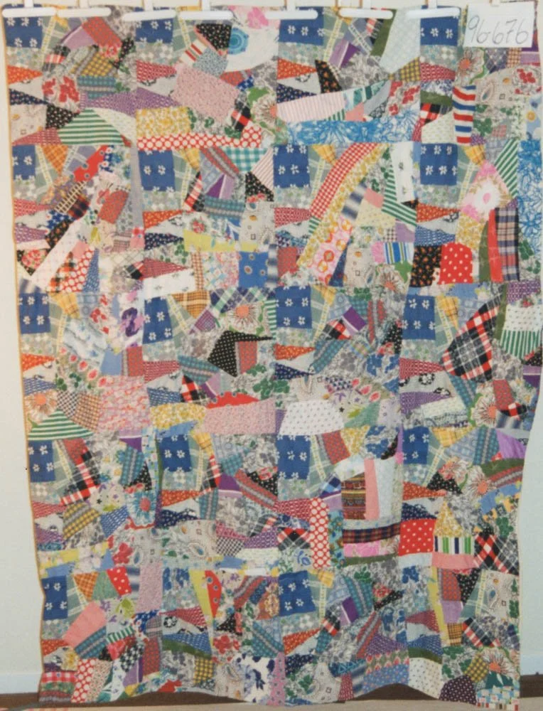 #96-676 1960sInvernessUtilityCrazyCottonFlour BagsFlanneletteStraight SetTurned TogetherHand sewn Aug 2 Written By Christel LeBlanc Quilt made by Claire Pitre in Creignish Rear, Nova Scotia Christel LeBlanc http://forestfriend.ca/