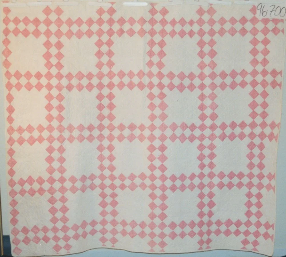 #96-700 1890sGuysboroughUtilityIrish chainCottonDiagonal SetHung SetFront Turned BackMachine and hand sewnInheritance Aug 1 Written By Christel LeBlanc Quilt made by Mary Jane Callaghan in Manchester, Nova Scotia Christel LeBlanc http://forestfriend.ca/