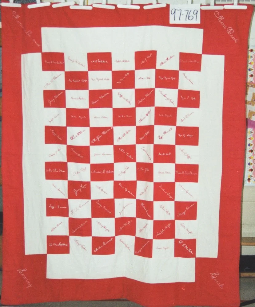 #97-769 1900sHantsFundraiserGroup ProjectSignature/autograph/albumEmbroideredCottonStraight SetMachine and hand sewnInheritance Jul 28 Written By Christel LeBlanc Quilt made by Moose Brook/Minasville Sewing Group in Moose Brook & Minasville, Nova Scotia Christel LeBlanc http://forestfriend.ca/