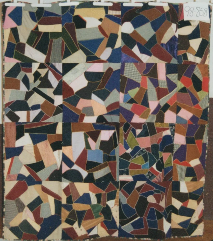 #98-858 1920sLunenburgCrazyCottonWoolVelvetSilkLinenStraight SetHome-cut Straight BindingFront Turned BackHand sewnInheritance Jul 27 Written By Christel LeBlanc Quilt made by Annie Zwicker in Lapland, Nova Scotia Christel LeBlanc http://forestfriend.ca/